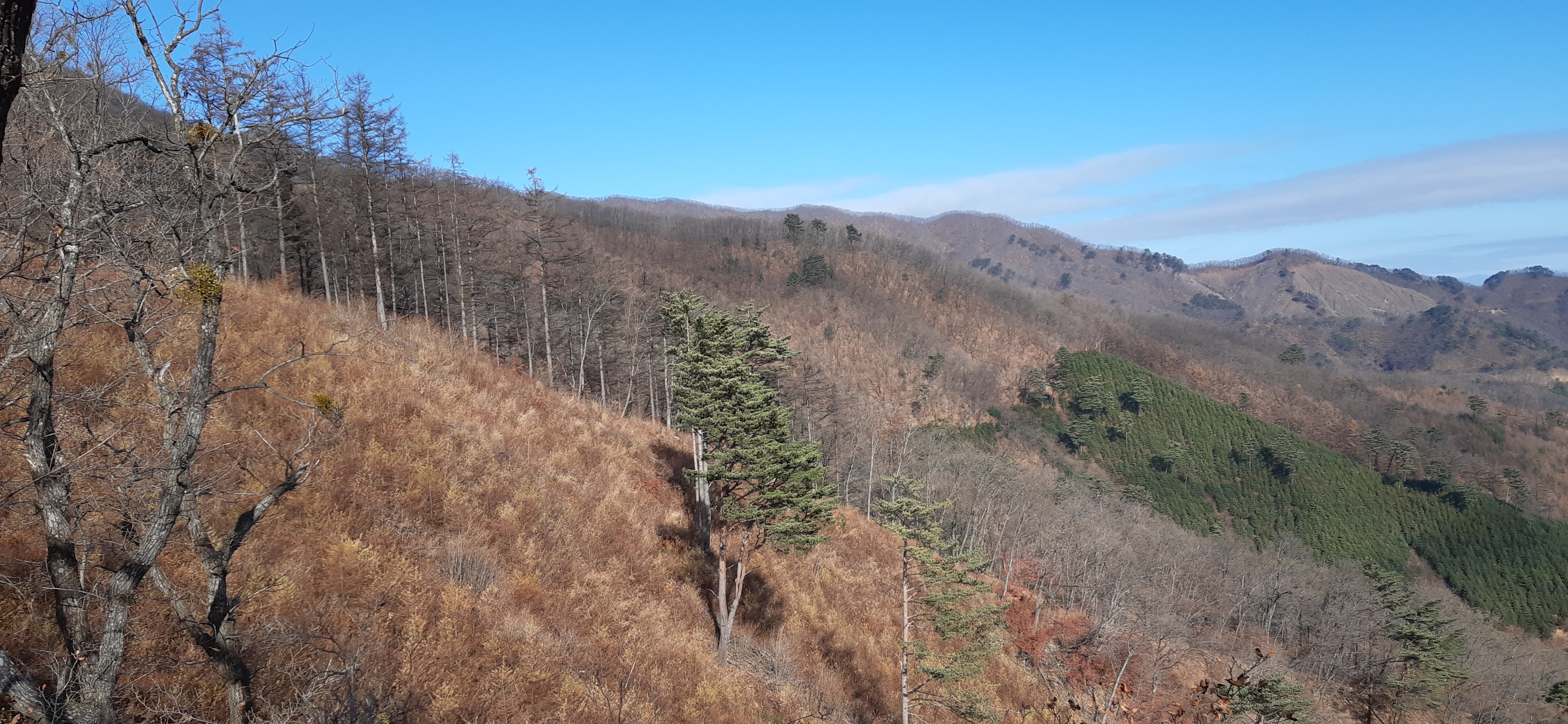미끄럽고 가파른 능선을 지팡이와 나무에 의지한 채 올라가기를 반복하니 가파름이 수그러들고 우측으로 벌목지대와 낙엽송지대를 통과한다.