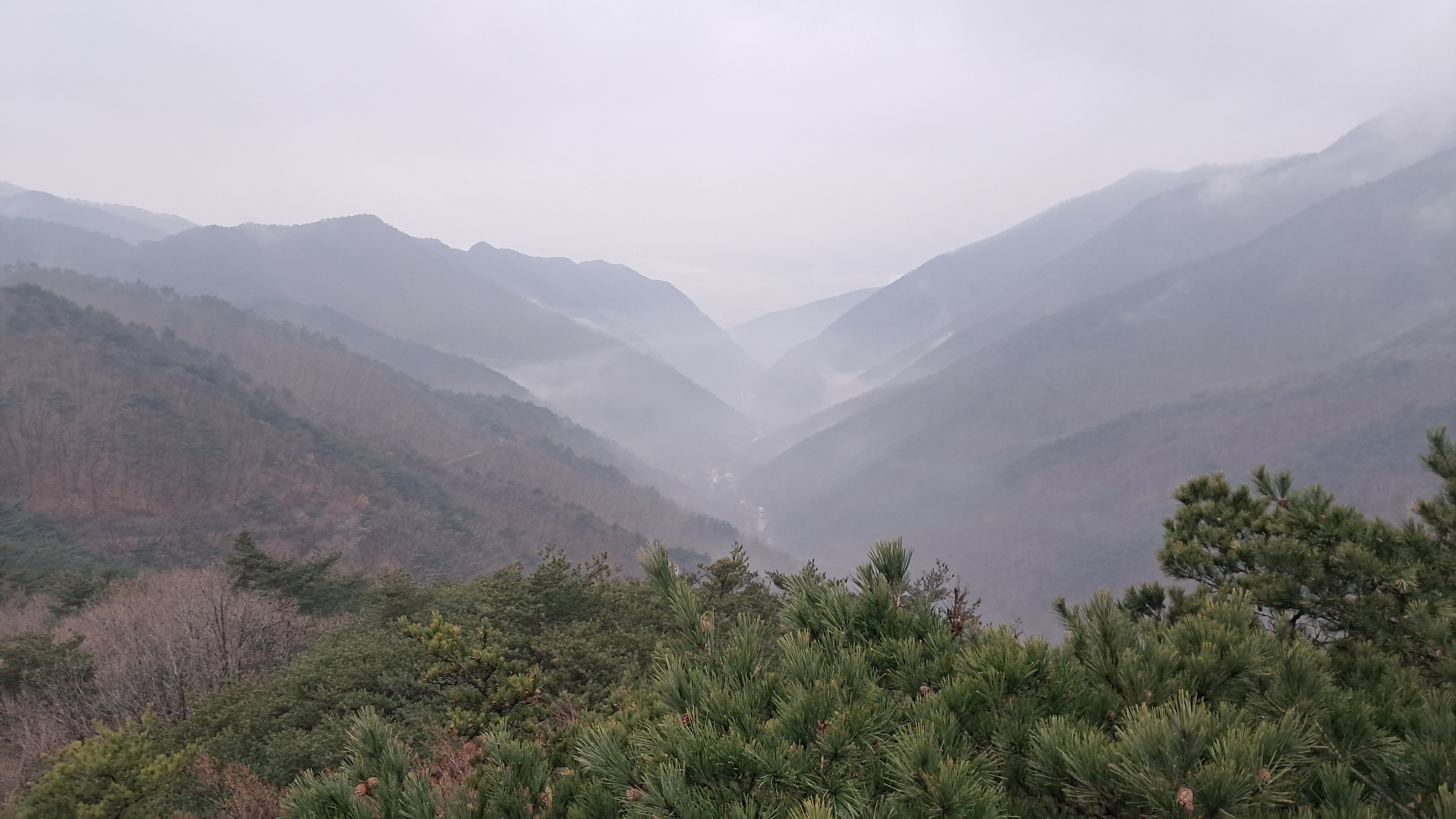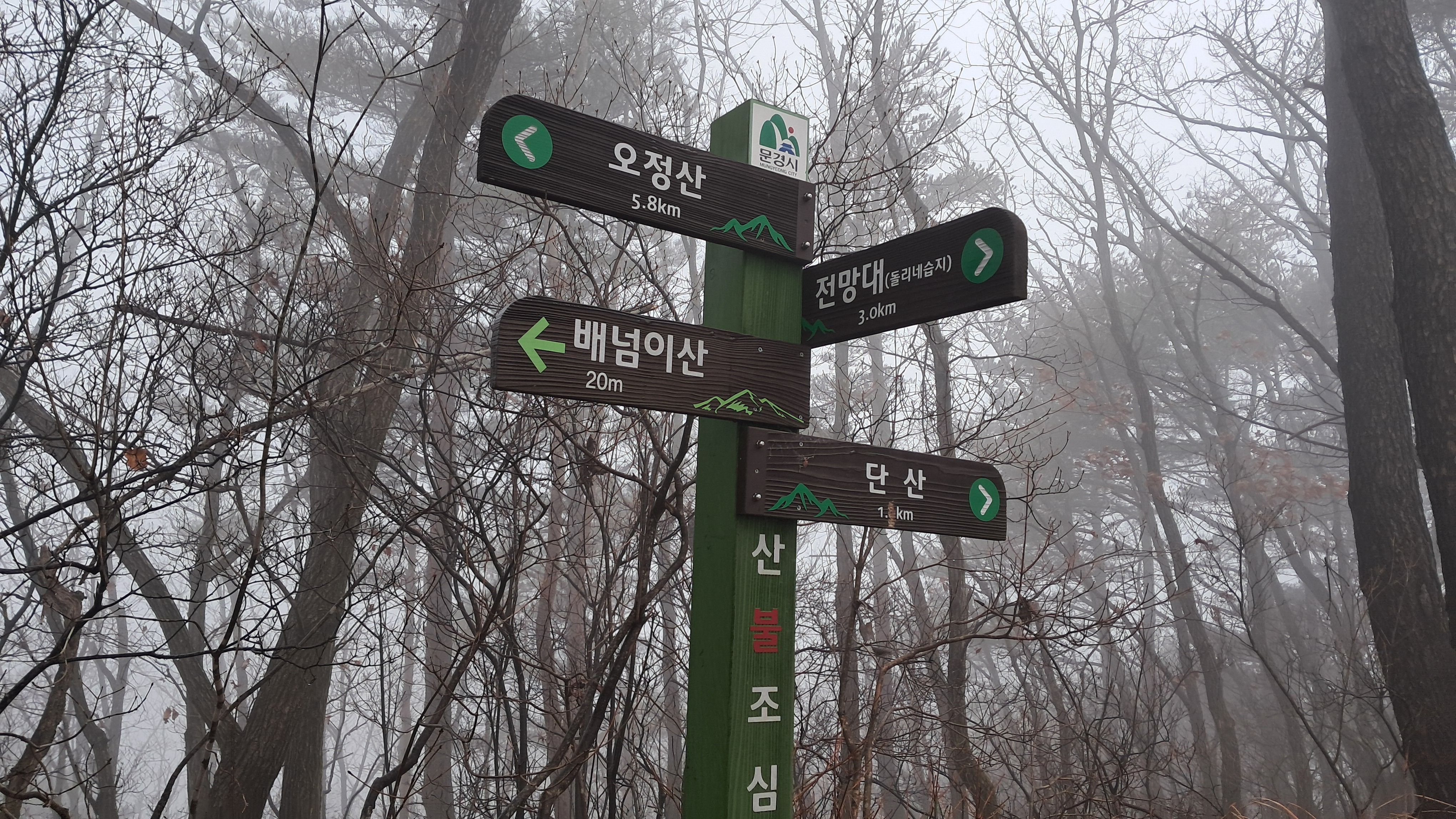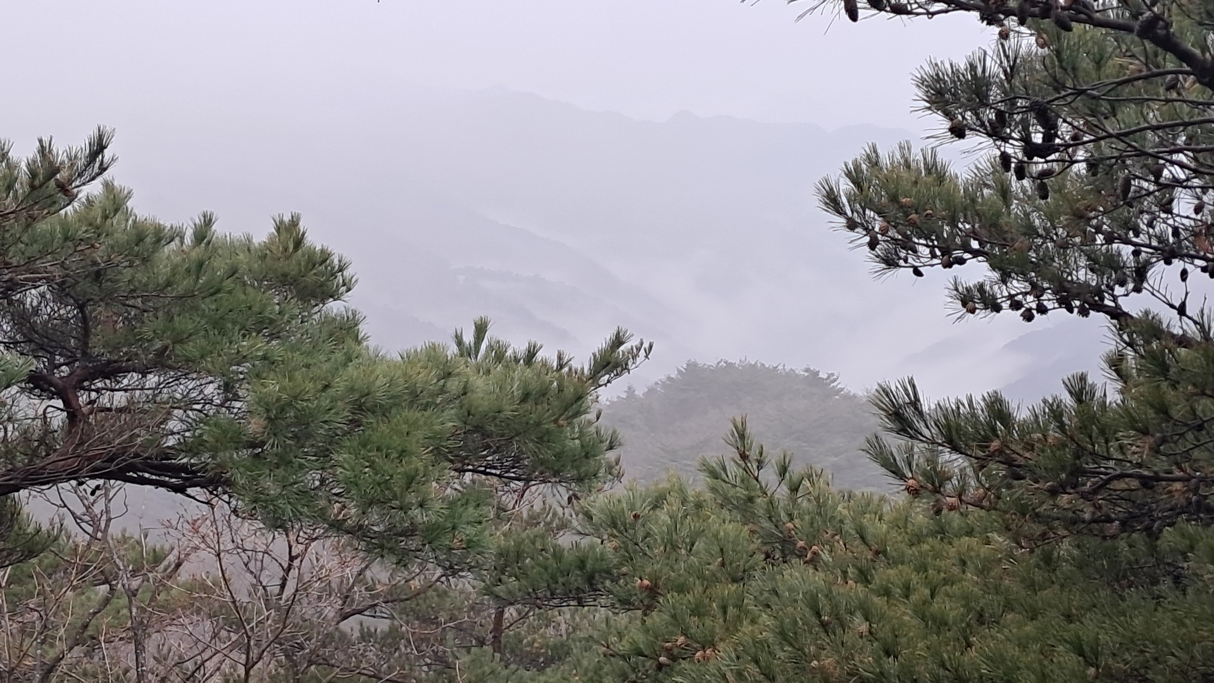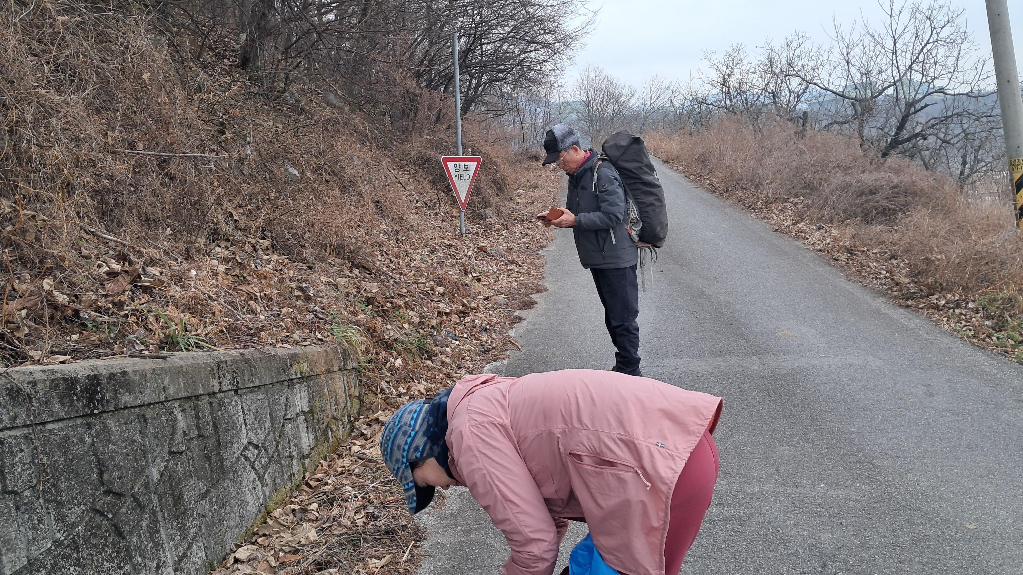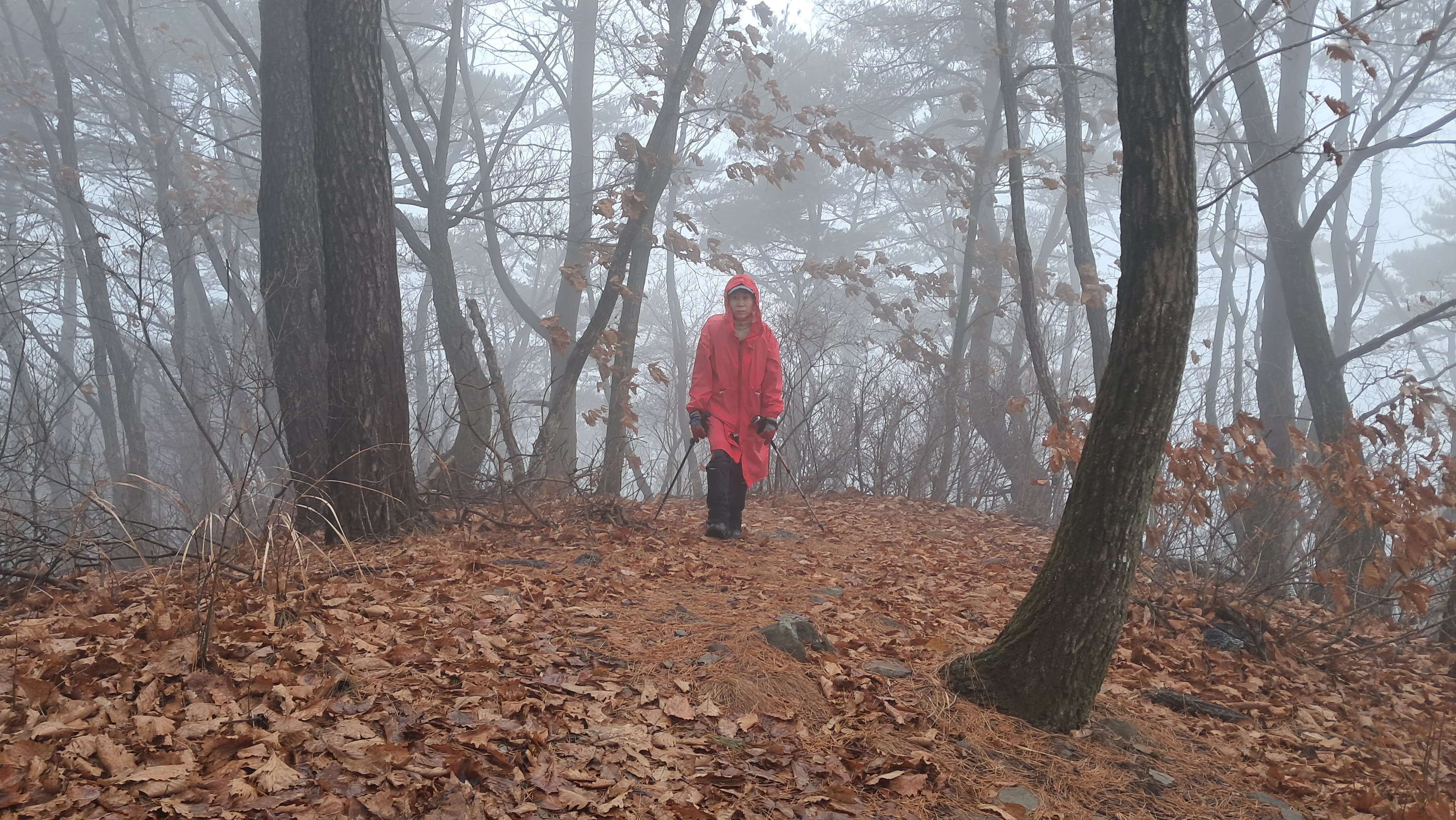 잠시 산악도로를 따르다가 도로가 길게 능선을 돌아갈 즈음, 능선으로 붙었다가 온갖 가시나무가 발목을 잡는 바람에 다시 산악도로와 만나면서 순순히 도로를 따라 올라간다. 탄광봉즈음에서 악수님은 탄광봉으로 향하고 우리는 도로따라 올라가다가 다시 악수님과 마주할때쯤 겨울비가 내리기 시작한다. 제법 많은 비가 내려 우비를 덮어있고 단산으로 향한다.