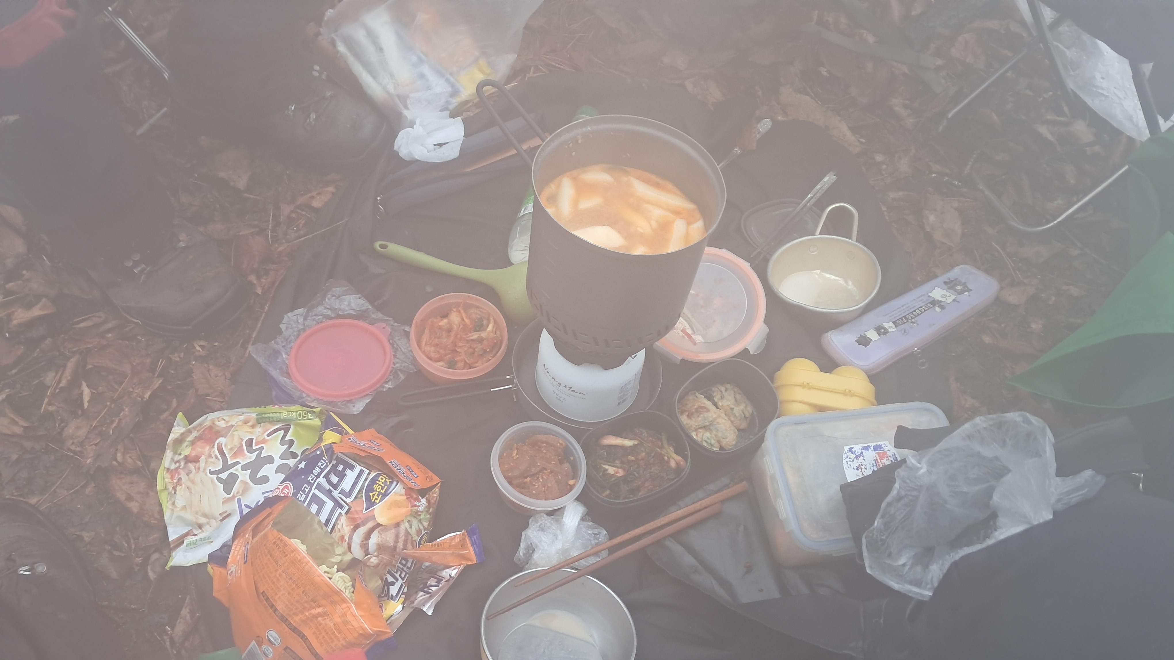 ▼ 정상을 내려와 비닐쉘터치고 점심을 먹고