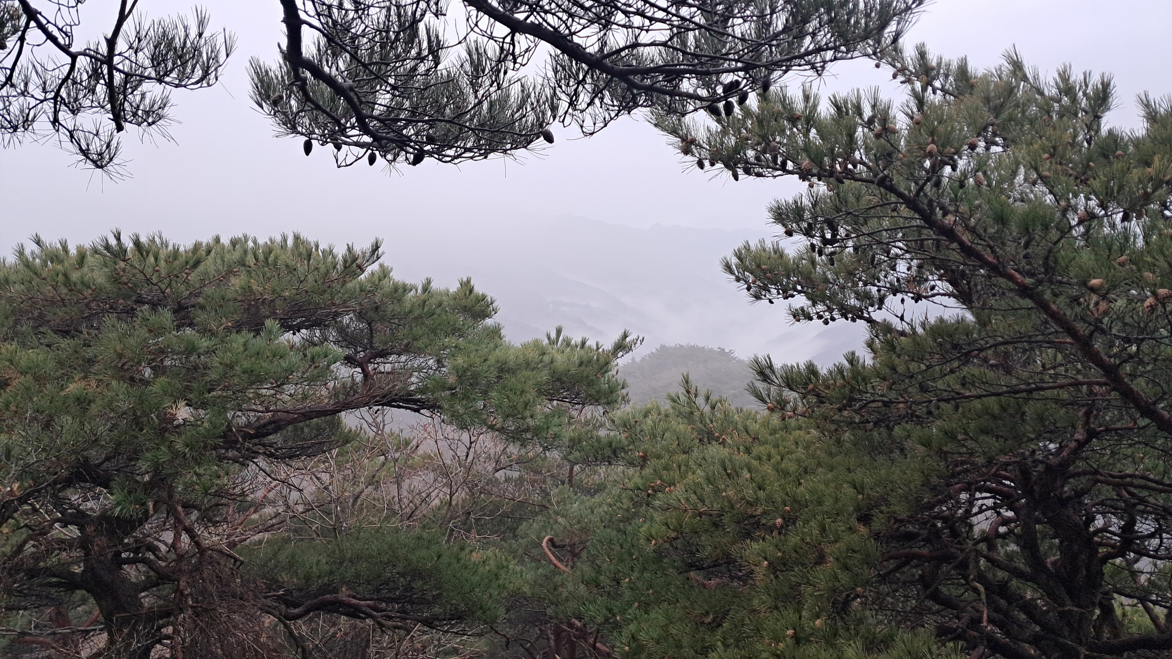 배나무산정상을 너머 오정산까지 가신다는 악수님을 먼저 보내드리고 둘이서 천천히 내려가니 단산계곡쪽으로 나무가지사이로 멋진 풍경이 보기 시작한다. 조금 더 진행하니 전망대가 나오고 입이 떡벌어지는 절경이 눈에 들어온다. 보통 비가와도 보기 힘든 구름과 안개와 산들이 만들어낸 절경을 악수님이 바라보면서 우리를 기다리고 있다. 더불어 맘껏 절경을 눈에 담고 부운령으로 내려서니 이곳에도 나무데크전망대를 만들어 놓았다. 점촌방향으로 조금전보다는 못하지만 멋진 풍경을 만들어내고 있다.