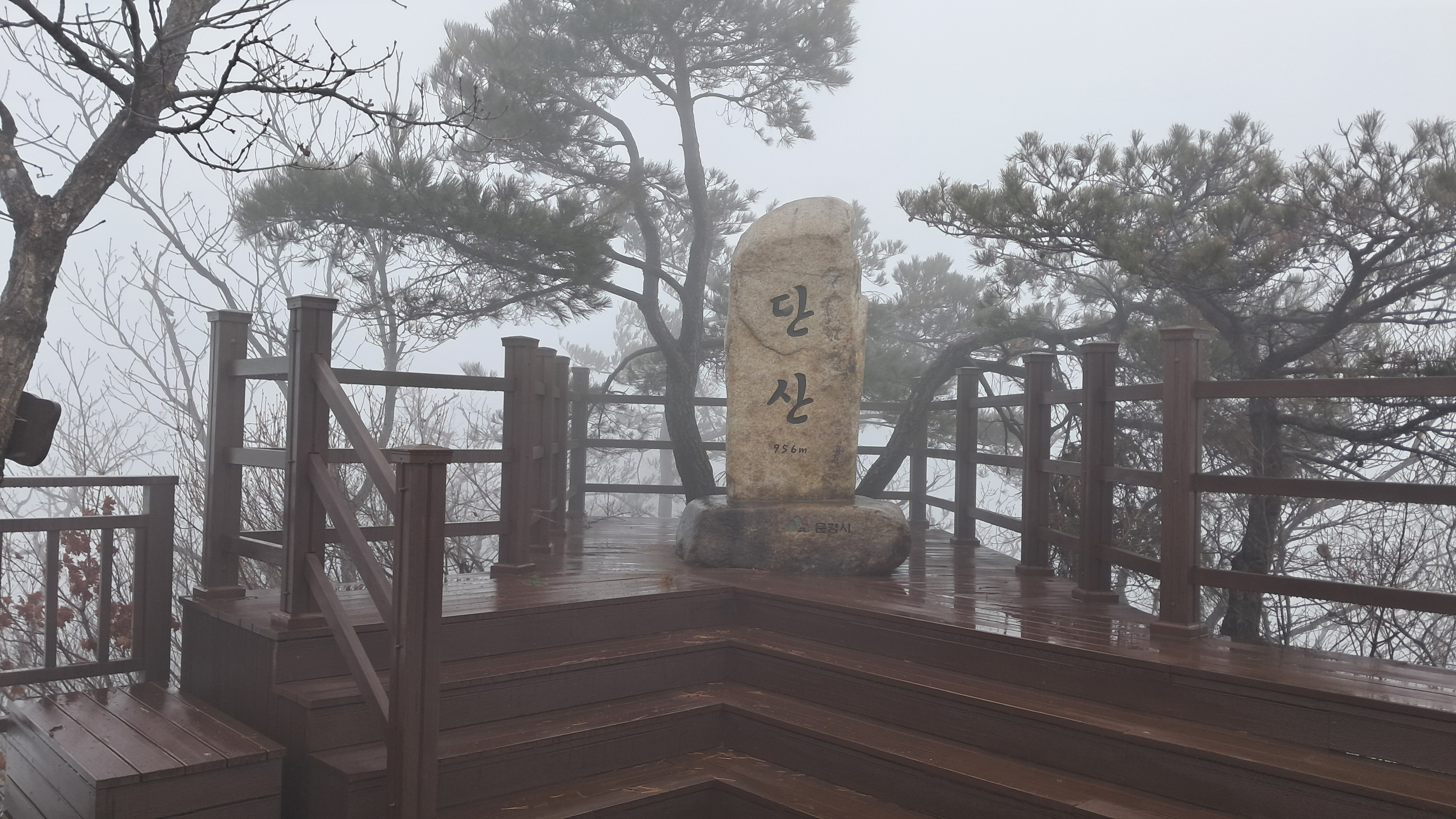 ▼ 훌쩍 뛰어 단산이네요. 비에 젖은 정상석