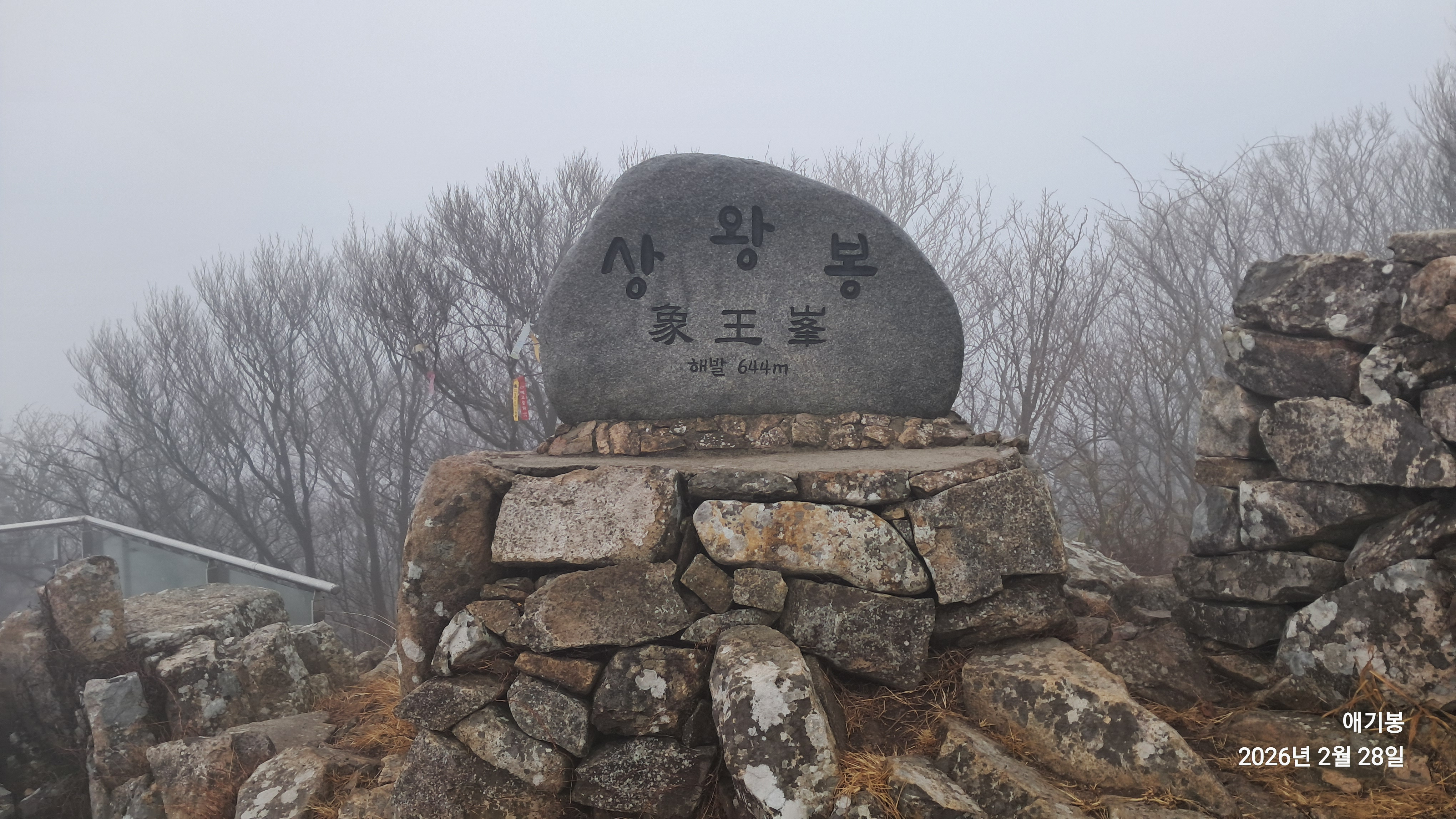 캄캄한 밤중에 손전등에 의지한 채 길을 나선다. 먼저 출발한 일행들을 따라 오르니 산행안내도가 보이고 동네안길을 지나 임도따라 올라간다. 삼거리에서 임도를 우측으로 보내고 왼쪽으로 올라서니 묘지가 나타난다. 잠시 불을 꺼 하늘을 올려다보니 별들이 초롱초롱 빛난다. 서울근교에서는 보지 못하는 풍경이다. 다시 불을 켜면서 본격적인 산행이 시작된다. 불빛이 힘을 잃을 무렵 동이 서서히 터오고 주변산자락과 바닷가가 희미하게 나타난다. 7시무렵 날은 훤하게 밝아 오고 바위정상인 심봉에 도착하니 벌써 해가 훌쩍 떠올랐다. 멋진 운해속에 주변경관을 구경하고 구름속에 가려있는 상왕봉으로 향한다. 맞은 편에서 오는 산객1명이 엠티에서 왔냐하며, 심봉을 다니려 간다고 한다. A코스에서 출발한 산객인데 발이 무척이나 빠르다. 잠시후 정상에 도착했지만 구름속이라 사방이 무망하다. 그래도 나무데크에서 정상주와 아침을 간단히 해결한다.